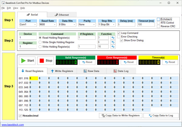 This complementary program allows users to test and troubleshoot Modbus RTU and Modbus TCP communication by sending single or multiple read or write commands to the connected device. The software offers comprehensive data-logging, data-formatting and error checking features.